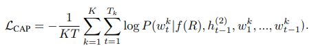 그림 3과 같이 LSTM의 두 번째 레이어는 인풋 쿼리 문장을 재생성하도록 요구합니다. 이때 시각적 특성 f(R)에 조건을 둬, 단어 w_t를 생성할때, 이전 단계에서의 hidden state를 사용합니다. 저자는 표준화된 log likelihood의 합이 최대화되는 문장 캡셔님 손실을 사용합니다.