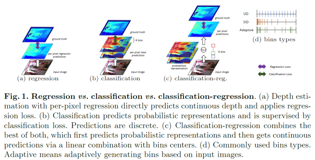 하지만 이러한 regression 방식으로 모델을 학습하고 prediction하는 것은 학습 수렴이 느리고 정확도도 아쉽다고 합니다. 그래서 깊이 추정을 N개의 bin들을 통해 해당 거리에 해당하는 빈 값을 고르는 classification 문제로 풀고자 하는 방법론들이 등장했습니다.