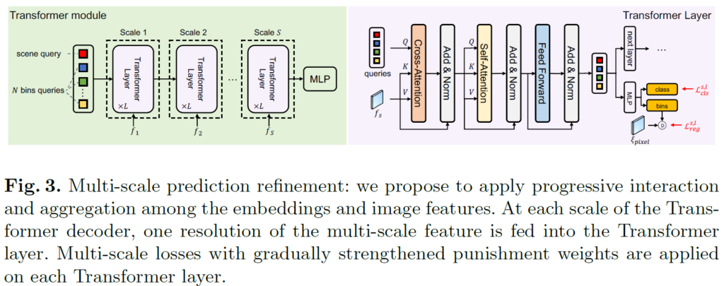 그림3을 보시면 multi-scale refinement 과정을 확인하실 수 있는데, 먼저 하나의 scale에 대해 Transformer 연산이 수행하는 과정을 보다 자세히 살펴보면, Query는 bin query, K와 Value는 per-pixel module에서 생성된 multi-scale feature map 중 하나로 cross-attention 한번 진행하고, 그 이후에 self-attention을 통해 정보 통합을 한번 더 수행합니다.