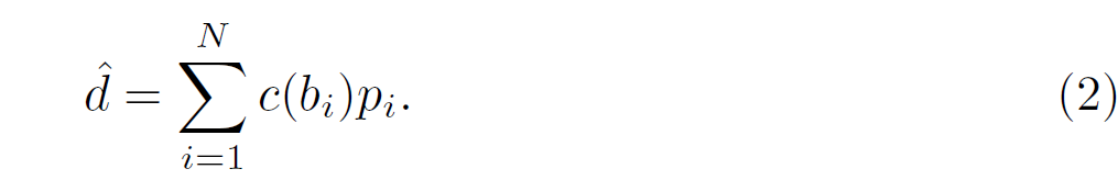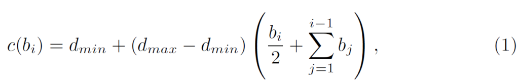여기서 d_{min}, d_{max} 는 각각 해당 데이터 셋의 최소 거리와 최대 거리를 의미합니다. 그리고 c(b_{i}는 i번째 빈의 중심 빈이라고 합니다.