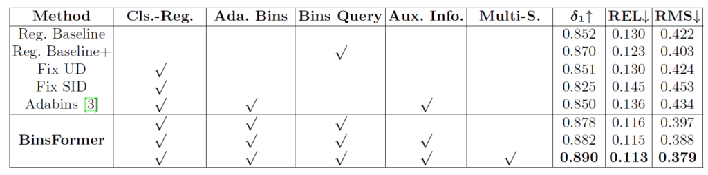 저자들은 우선 고정된 bin을 활용하는 UD와 SID 그리고 이전 SOTA인 adabin의 bin방식과 비교하여 자신들이 제안하는 Transformer decoder 기반의 bin 활용 방식이 가장 좋은 성능을 보여준다라는 것을 주장합니다.