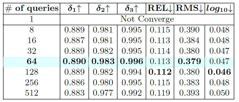 위에 표는 query의 길이에 대한 ablation study로 query의 개수가 너무 커지는 것은 오히려 성능에 감소를 불러일으키며 32~128 사이에 가장 적당했다고 합니다. 성능과 연산량 측면에서 64를 저자는 가져갔다고 하네요.