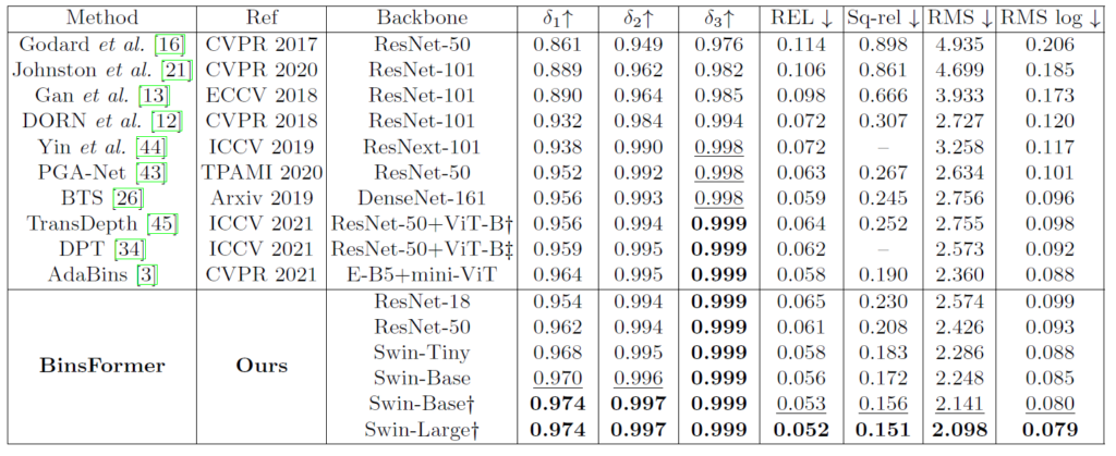 위에는 KITTI dataset에 대한 결과로, 해당 논문에서 모델의 크기 등의 비교를 안해주기에 정확한 비교는 조금 어려워보입니다. 특히 서로 다른 백본을 지니고 있는터라 모델의 크기 대비 누가 더 좋은 성능을 보여준다라고 말하기에는 어려운 상황인데, 일단 Swin의 Base 이상 모델을 활용할 경우 모든 메트릭에서 가장 큰 성능을 보여주고는 있습니다. 근데 저 십자 표시는 imagenet22K 사전학습을 의미하는지라 사전학습된 데이터의 양에서도 아마 차이가 존재할 것으로 여겨집니다.