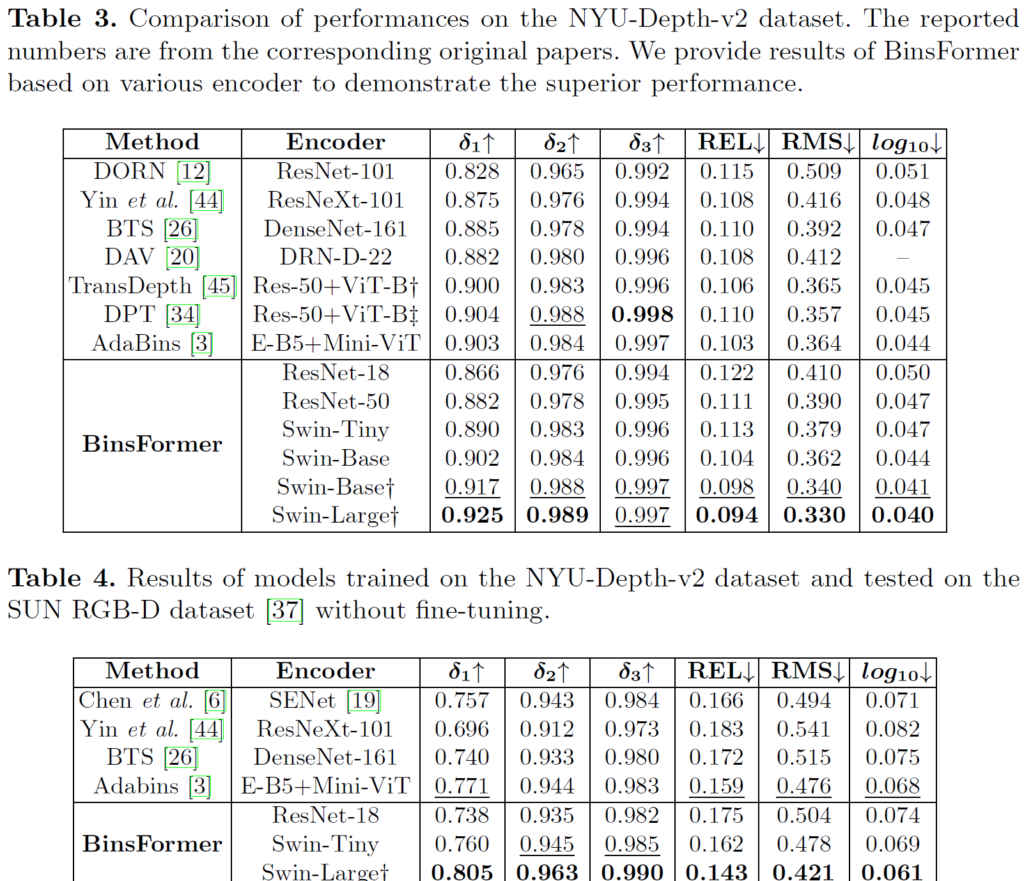트랜스포머를 활용해 영상의 특징 자체를 CNN에서 대체하는 방법론이 아닌 깊이 추정에 핵심인 bin 값을 잘 만들어보자라는 측면에서 컨셉 자체는 재밌게 여겨졌던 논문입니다만, 실험단에서 타 방법론과의 직접적인 성능 비교가 어렵다는 점에서 아쉽게 느껴진 논문입니다. 그래서 다른 학회를 붙지 못한 것인가? 싶기도 하구요.