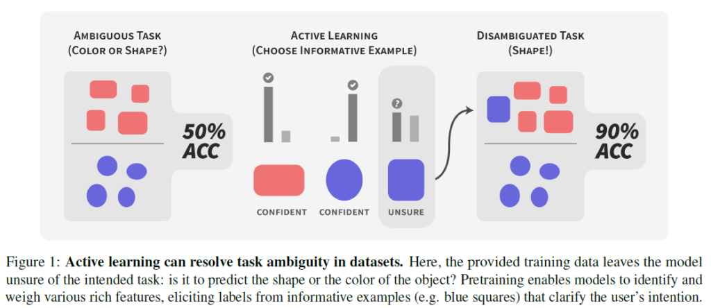 Task ambiguity는 사용자가 의도한 task와 다르게 데이터가 가지는 특성만 고려하면 사용자의 의도와 다르게 task가 정의되는 현상을 말합니다. 위의 그림에서 모양을 분류하는 task로 모델을 시켰는데, 정작 모델은 색상 정보에 집중해서 학습을 진행했을수도 있습니다. 저자들의 주장은, 사전학습 모델을 활용하면 데이터에 대한 특징을 어느정도 더 잘 추출할 수 있는 능력을 가질 수 있다는 것입니다. 결국 데이터가 부족해서 다양한 문제(small dataset에서 발생하는 가짜 상관관계나 data에 대한 distribution 변화)가 일어날 수 있는 Active Learning 적용 상황에서 사전학습을 활용해 이런 문제점을 완화해 사용자가 의도한 방향대로 Active Learning을 가져가자는 것입니다.