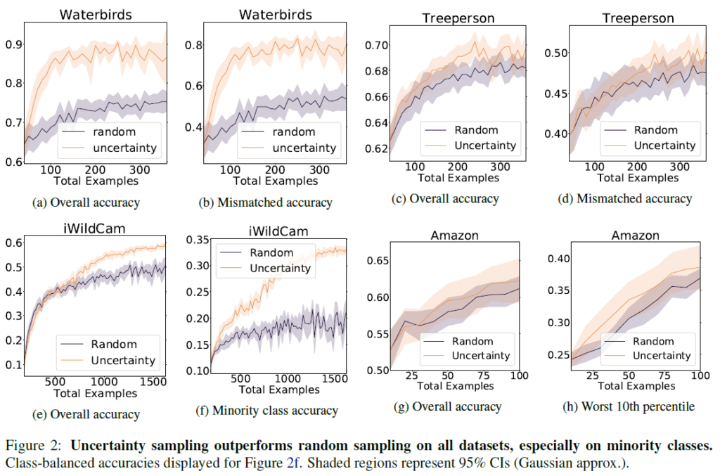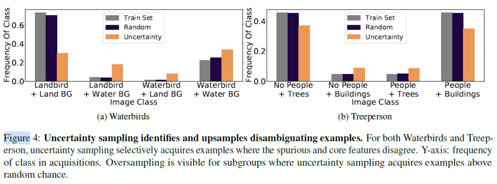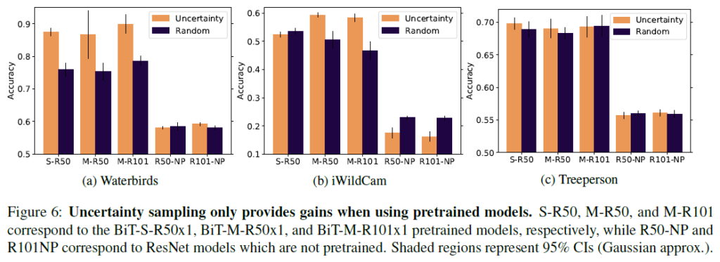 baseline으로는 AL을 적용하지 않은 random sampling과 비교했습니다. 사전학습하지 않은, 일반적인 초기화 버전도 함께 비교했으면 좋았을텐데 아쉽네요. mismatched accuracy는 spurious correlation에 해당하는 데이터에 대한 accuracy라고 보면 됩니다. 각 데이터들이 상당히 편향된 상태로 학습했음에도 불구하고 좋은 AL 성능을 보여줍니다. Waterbirds에서는 새와 배경이 일치하지 않는 것을 oversampling한다고 합니다. 저자들은 모델이 spurious feature(가짜 특징.배경)과 causal feature(인과 특징.새 종류)간 일치하지 않는 데이터들을 식별한다고 해석합니다. Treeperson과 Amazon dataset에서도 동일하게 긍정적인 경향성을 보인다면서, 저자들은 사전학습 모델의 긍정적인 효과가 다양한 modality에 확장 가능한 것으로 기대한다고 합니다.