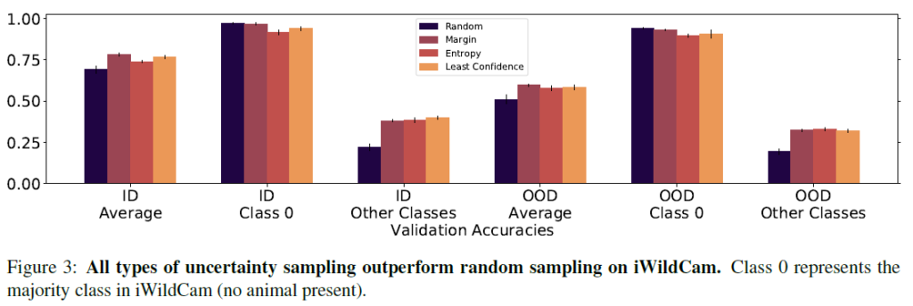 iWildCam에서는 margin sampling, entropy sampling, least confidence sampling의 3가지 uncertainty sampling이 모두 random을 뛰어넘는 성능을 보였습니다. Class 0의 경우는 동물이 촬영되지 않은 majority class임을 감안하고 보시면 됩니다.