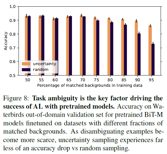 Figure 8은 task ambiguity가 AL에 얼마나 영향을 주는지 보여줍니다. waterbird dataset에서 mismatch 비율을 50%~95%로 변화시키며 실험을 진행하였는데, pretrained AL이 random sampling보다 acc 하락이 훨씬 적은 것을 확인할 수 있습니다. 이에 저자들은 task ambiguity가 해당 세팅에서 AL이 baseline보다 잘 작동하게 하는 핵심 요소 중 하나라고 주장합니다.
