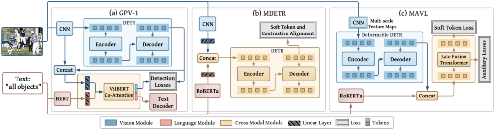 그래서 OWOD의 논문들을 차찬히 훑어보던 중, 물론 김태주 연구원께서 리뷰하신 OWOD의 시초인 Toward Open World Object Detection 논문을 처음 읽는 것이 맞았으나, PapersWithCode 기준 대부분의 OWOD 태스크에서 좋은 성능을 보이는 “Class-agnostic Object Detection with Multi-modal Transformer”가 눈에 들어왔습니다. 아래 그림에 보이는 해당 논문의 모델 구조를 살펴보니, (b) MDETR이라는 글이 보이더군요. 이번 논문은, 그런 연유로 읽게 되었습니다. GPV-1이 뭔지 잘 모르지만, 단순히 MDETR도 무엇인지 살펴보고 싶었습니다. OWOD 태스크의 논문은 아직 몇 십 단위에 머물러 있어 몇 달 노력하면 흐름을 이해하긴 하겠지만, 그런 와중 나오는 개념까지 파생해서 모두 이해하고자 하면.. 뭐 언젠가 하리라 생각합니다. 사담이 길었으니, 바로 시작합니다.