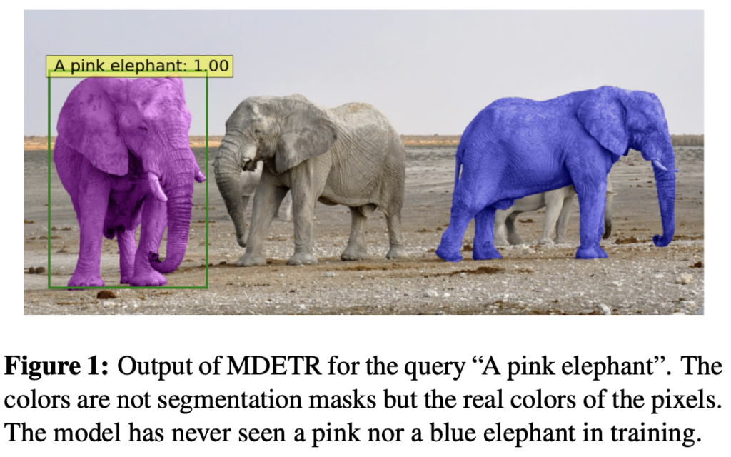 저자의 기 연구들에 대한 문제 정의는 위의 문단으로 정리할 수 있습니다. 저자는 DETR 프레임워크에 기반을 둔 End-to-End 방식의 변형도니 DETR인 MDETR을 소개합니다. MDETR은 이미지에 대한 이해를 위해 Supervision의 형태로 Text와 Text에 Align된 BBox에 대해 학습하는 형태입니다. 이 때 Align되었다는 의미는 후에 DETR에 대한 개념을 다시 짚어보면 더 잘 이해할 수 있겠지만, 지금은 아래 Figure 1처럼 “A pink elephant”에 맞는 BBOX로 이해하면 됩니다.