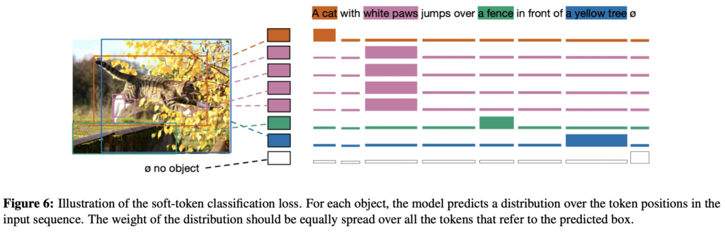 우선, Soft token prediction은 Non-parametric한 Alignement Loss입니다. 제가 MDETR Architecture에 대한 소개의 마지막에서 “Text에 나타는 Object들에 대한 Class를 예측한다”고 설명하였는데, 결국 우리가 MDETR이라는 모델을 사용하여 할 일은 예를 들어 “텍스트를 보고, 영상에 나타나는 객체와 텍스트를 매칭하여 찾아내기”입니다. 저자도 이 점을 언급하죠. “우리는 예측한 객체 가각에 대한 클래스를 예측하는데 관심이 없다”, 이는 곧 전통적인 OD와는 그 의의가 다르다는 점입니다. 텍스트에서 이미 찾아야 할 대상을 기반하고 있죠. 다시 말해 원본 텍스트로부터 나온 토큰들과와 이에 매칭되는 각각의 객체들에 대해 예측하고자 합니다.