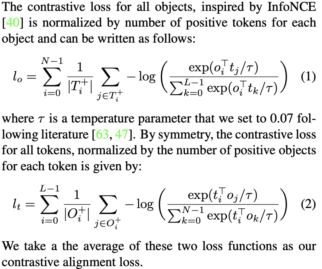 이해를 위해 해당 설명 글까지 함께 첨부하였는데요, InfoNCE Loss와 동일한 방식으로 작동하며 L, N 이 각각 토큰의 최대 수와 객체의 최대 수로 두고, |T_i^+|, |O_i^+| 를 각각 Object가 Align되어야 할 Token의 집합, Token이 Align 되어야 할 Object의 집합으로 두고 나면, 나머지는 Negative Sample이니 멀어져야하죠. 최종에는 둘의 평균을 contrastive alignment Loss로 정합니다.