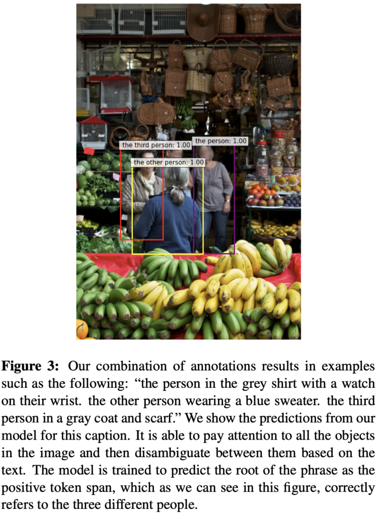 Pre-training Modulated Detection Pre-training 시의 목적은 Free-Form으로 주어진 텍스트 내 모든 객체를 검출하는 것입니다. 이를 달성하고자 하는 간단한 방법은 많은 양의 데이터를 학습시키는 것입니다. 저자는 Flickr30k, MS COCO, Visual Genome (VG)의 영상 데이터를 결합한 결합 데이터 셋을 만들었습니다. Referring expression datasets, Flickr entities, 그리고 GQA train balanced set으로 부터 학습을 위한 어노테이션을 가져와 이를 정제하였습니다. 결국 이러한 방법들로부터 이미지 하나는 연관된 텍스트 어노테이션을 여러 개 가질 수 있는데, 저자는 이 점이 데이터 효율성 관점에서 좋으며 또한 단 하나의 문장만 있다면 Trivial solution에 빠져 모델이 이미지에 대한 이해 없이 문장만 볼 수 있으나 데이터 결합 과정을 통해 같은 객체 클래스가 여럿 나오더라도 이들 간의 모호함을 잘 구분하여 각각을 잘 구별해낼 수 있다고 봅니다. 아래 Figure 3을 잘 살펴보시죠!