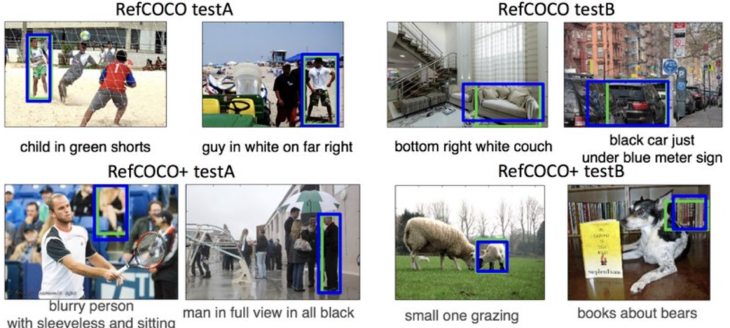 Referring expression comprehension 해당 태스크는 Referring expression으로부터 참조 대상이 되는 하나의 객체의 BBox를 찾아내는 태스크입니다. 위의 Phrase grounding이 객체의 클래스가 문장 내 명확히 나타난다면, 해당 태스크는 추론 과정이 필요합니다. 아래의 데이터 예시를 살펴보죠 해당 태스크에 대한 선행 연구들은 보통 사전학습된 Detection 모델로부터 검출한 경계 박스에 대한 순위를 매기는 정도였습니다. 순위를 매긴다는 의미는 아마 방법에 따라 상이하겠죠. 저자는 이와 달리 텍스트와 이미지를 입력으로 넣기에 직접적으로 예측하도록 설계하여 학습하였습니다. 이렇게 보니 RoBERT-a의 Text Encoder는 얼마나 좋길래.. 싶네요
