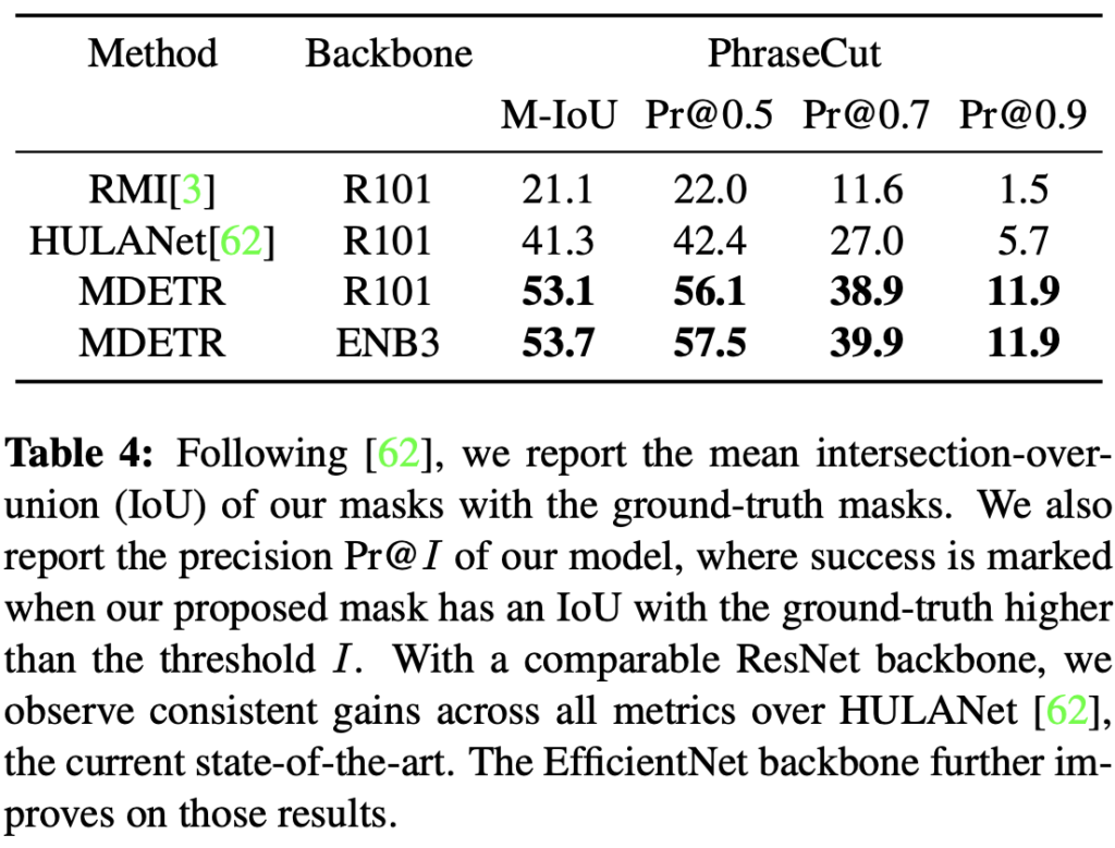 역시나 SoTA의 성능을 보입니다. 신기하게도 많은 데이터 셋을 사용하면서도 모두 SoTA를 달성하니, 이는 해당 MDETR이 정말 좋구나 싶네요.