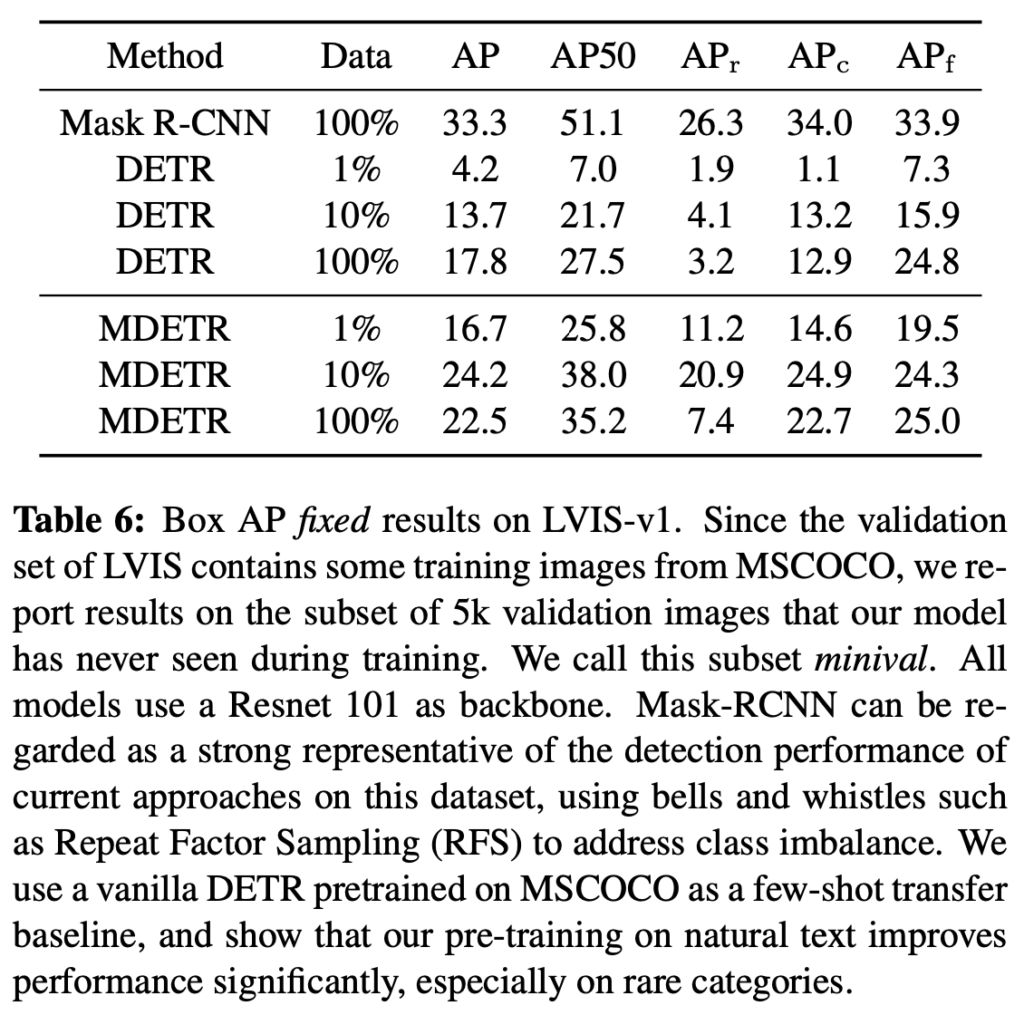 Few-Shot Object Detection Few-Shot OD에서도 사용이 되었네요! LVIS-v1 데이터와 MS-COCO 데이터 중 겹치지 않는 클래스에 대해 선별하여 학습 및 평가를 하였으며 성능만 간략히 살펴보겠습니다. DETR과 비교하는데, 뭐 사실 텍스트를 동시에 사용하기 때문에 조금 더 다양하게 그 의의를 분석하면 좋지 않았을까 싶습니다.