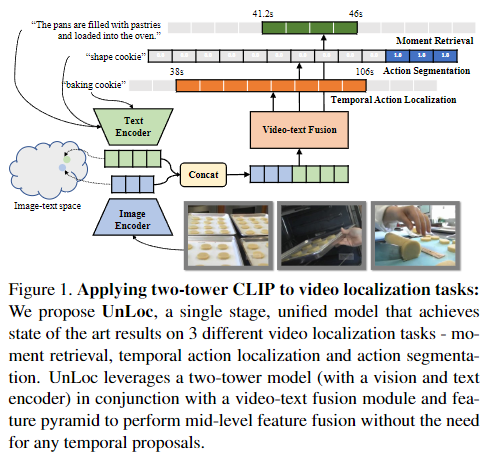 trimmed video을 다루는 tasks에서는 CLIP과 같은 image-text 사전 학습 모델을 활용하는 연구가 많이 진행되고 있습니다. 하지만, untrimmed video를 다루는 tasks에서는 CLIP을 활용하는 연구가 아직 많이 진행되지 않았습니다. 따라서 저자는 untrimmed video에서 사전 학습된 image-text 모델과 feature pyramid를 활용하여 프레임 단위로 relavancy score와 start/end time displacements를 예측하는 모델 UnLoc을 제안합니다. UnLoc은 Moment Retrieval, Temporal Localization, Action Segmentation 총 3가지 task에서 활용 가능한 모델입니다.