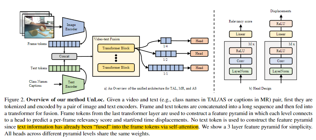 UnLoc은 video, text 쌍을 입력으로 받아 비디오의 각 프레임에 대해 프레임과 입력 텍스트의 관련성 점수(relavancy score)를 구하고 예측 segment의 start/end timestamp와의 시간 차이를 출력합니다. 프레임이 라벨링된 segment에 포함된다면 1, 그렇지 않은 경우에는 0으로 설정됩니다. TAL과 AS는 클래스 라벨을 입력 텍스트로 사용하고 MR의 경우에는 텍스트 쿼리를 입력 텍스트로 사용합니다. 비디오마다 C개의 video, text 쌍을 생성합니다. TAL, AS에서는 C가 클래스의 수가 되고, MR에서 C는 비디오와 관련있는 captions의 수가 됩니다.