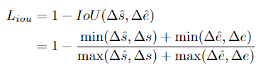 L1 loss는 예측 start/end time과 정답 start/end time과의 차이의 절대값을 뜻합니다. IoU loss는 다음과 같이 정의되는 집합의 교차점을 직접 최적화합니다
