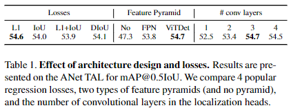 AS의 경우에는 프레임과 클래스 라벨 간의 관련성 점수 계산을 위해서 sigmoid cross entropy loss를 사용합니다. TAL과 MR의 경우에는 클래스 불균형은 1-stage detector에서 이미 알려진 문제이므로 관련성 점수에 focal loss를 사용합니다. 저자는 regression에서는 4개의 많이 사용되는 regression loss를 비교해 시험했습니다. L1, IoU, DIoU, L1+IoU입니다.