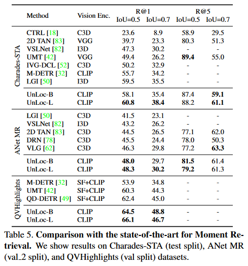 Moment Retreival에서의 UnLoc-B와 UnLoc-L의 성능은 다음과 같습니다.
