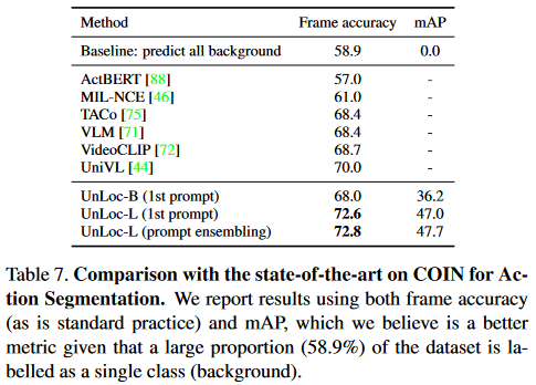 Temporal Action Localization에서는 zero-shot 실험도 진행했으며 성능은 다음과 같습니다. UnLoc-L에 1st prompt는 training에서 설명드린 class label을 “a video of a person doing {label}”의 문장 형태로 프롬프팅하는 것입니다. prompt ensembling은 위의 프롬프트 외에도 여러 프롬프트를 사용해 앙상블을 한 모델이라고 합니다. 구체적으로 어떠한 prompt를 사용했는 지에 대한 언급은 없습니다.