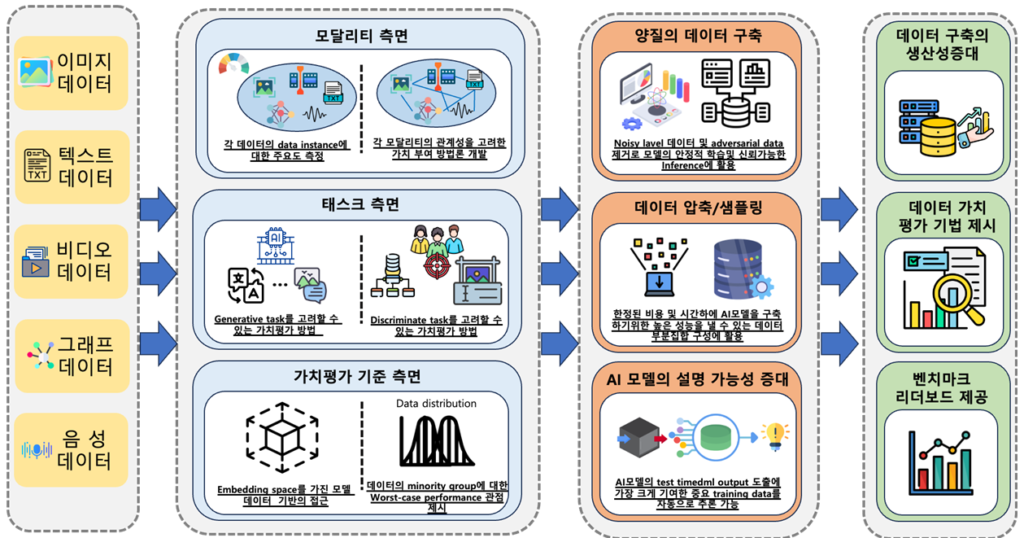 안녕하세요 정의철 연구원입니다. 이번에는 논문 리뷰가 아닌 X-diary로 작성하게 되었습니다. 저희 다크데이터팀은 2주 동안 기초연구실 과제 제안서를 작성했습니다. 이번 기초연구실 과제에서는 신뢰가능한 대형 AI를 위한 데이터 기반 연구에 중점을 두었습니다. 이번 연구의 목표는 3차년도 계획으로 세분화되었습니다. 1차년도는 각 모달리티에 특화된 데이터 가치평가 방법론을 개발하는 것이고 2차년도는 각 Task에 특화되며 Multi-Task 상황을 고려할 수 있는 데이터 가치평가 기법을 구축하는 것. 마지막 3차년도는 대형 멀티모달-멀티태스크 상황에서의 데이터 가치평가로 확장하는 연구를 수행하는 것이였습니다. 연구 요약 이미지는 아래와 같습니다.