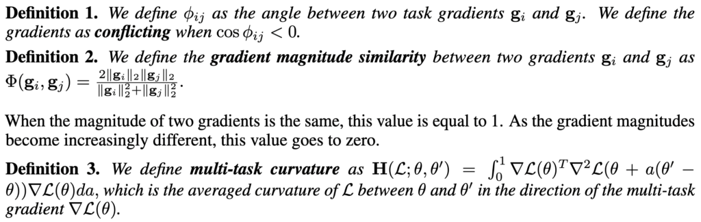 먼저 첫 번째 여러 작업의 기울기가 서로 충돌할 때는 두 task의 기울기 gi와 gj 사이의 각도 Φij를 측정하고 cos Φij < 0일 때 기울기가 충돌하는 것으로 정의합니다.
