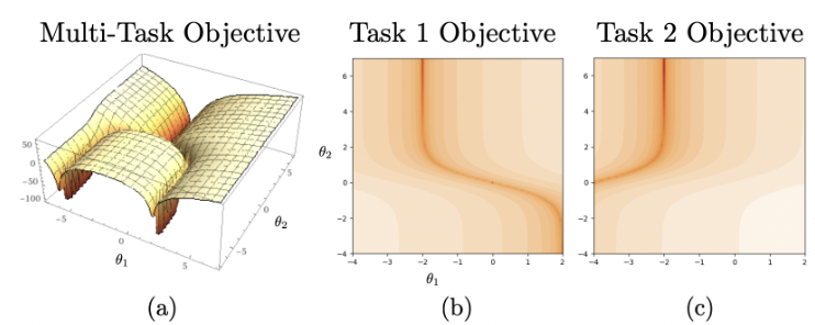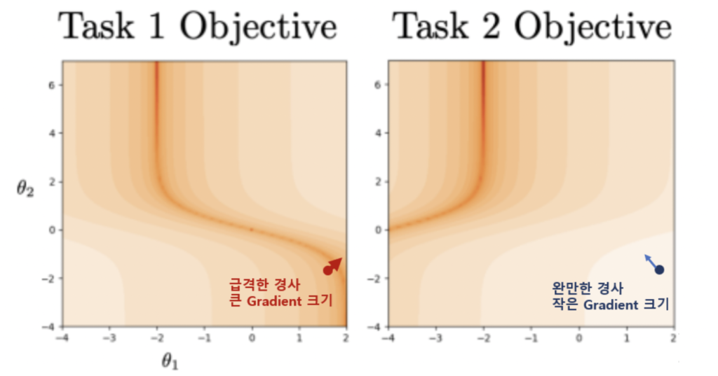 위의 그림에서 특정 같은 위치(같은 paramter 값일 때)에서 각 task 가 가지는 gradient 는 위 그림에 점과 화살표로 표기하였습니다. 그래프에 나와있듯이 Task1과 Task2의 gradient가 다를 경우 두 Task가 같이 최적화 되는 곳으로 수렴을 잘 하지 못하는 문제가 발생할 수 있습니다.