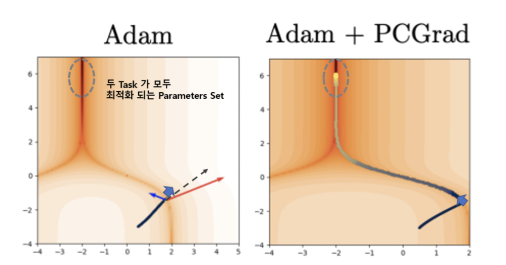 위 그림에서 왼쪽은 Adam optimizer를 사용했을때 Multi-task objective의 궤적을 설명한 그림이고 오른쪽은 저자가 제안하는 방법인 PCGrad를 사용했을때 Multi-task objective의 궤적을 설명한 그림입니다. 왼쪽의 경우 Multi-task gradient는 하나의 task gradient에 의해 지배될 수 있으며 다른 작업의 성능을 저하시키는 원인이 됩니다. 결과적으로 옵티마이저는 최적화 목표를 달성하는 데 어려움을 겪습니다. 반면 저자가 제안한 방법론을 적용시키면 안정적으로 최적화가 될 수 있다는 것을 보여줍니다.