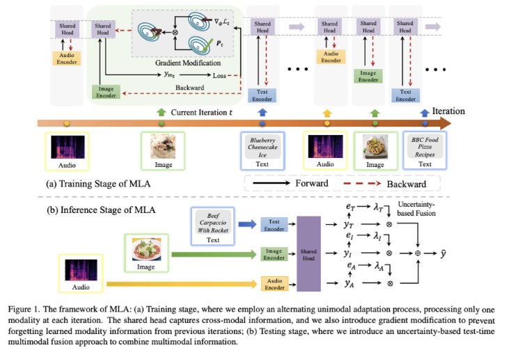 이 파트에서는 본 논문의 저자들이 modality laziness issue를 해결하기 위한 방법인 Multimodal Learning with Alternative Unimodal Adaptation (MLA)를 소개하고자 하는데요. MLA는 Figure 1과 같이 멀티모달 데이터에 대한 기존의 joint training 방식을 번갈아 가며 학습하는 uni-modal training framework의 관점에서 재구성하는 것을 목표로 합니다. 구체적으로 trining phase (Figure 1(a))에서 shared head를 사용하여 모달 간 정보를 유지하면서 각 모달에 대한 인코더를 번갈아 학습하는 방식입니다. 또한 shared head가 이전에 학습한 모달리티 정보를 잊어버리는 것을 방지하기 위해 gradient forgetting mechanism을 사용합니다. inference 가 과정에서 각 모달리티에 대한 예측의 uncertainty를 평가하여 멀티모달 정보를 융합하는 방식입니다. (Figure1(b) 참고). 다음으로, 세 가지 핵심 단계인 alternating uni-modal learning, learning cross-modal information without modality forgetting, test-time dynamic modality fusion을 소개하고자 합니다.