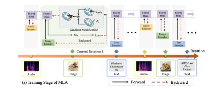 최근 연구에서는 최적화 과정에서 dominating modality와 subordinate modality의 영향력의 균형을 맞추기 위해서 몇 가지 연구가 진행되었는데요. 하지만 이러한 방법은 여러 모달리티별 인코더를 동시에 업데이트하기 위해 여러 모달리티의 공동으로 최적화가 필요하기 때문에 하위 모달리티에 대한 적응이 어느정도 저하되어 전반적인 멀티모달 성능이 제한됩니다. 이와는 대조적으로 본 논문에서는 alternating unimodal learning으로 분해하여 개념적으로 다른 방식으로 이 문제를 해결하고자 하였고, 이를 위해 Multimodal Learning with Alternating Unimodal Adaptation (MLA)이라는 방식을 제안합니다. MLA의 핵심 아이디어는 각 모달리티의 인코더를 교대로 최적화하면서 동시에 모달 간 정보를 통합하는 것입니다.