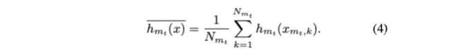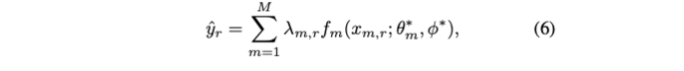 학습 과정에서 모달리티별 인코더와 shared head를 학습한 후에는 inference time 동안 예측을 위해 멀티모달 정보를 효과적으로 통합하는 방법에 중점을 둡니다. 이러한 멀티모달 fusion을 달성하기 위해 각 모달리티 예측에 weight를 부여하는 combination을 사용합니다. 구체적으로 M개의 모달리티가 주어진 test example $(x_r,y_r)$에 대해 다음과 같이 예측을 계산합니다.