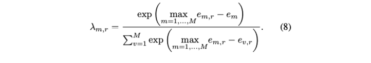 여기서 Softmax()는 output logits를 probability $p_{m,r}$로 변환합니다. entropy $e_{m,r}$이 높을수록 예측에 대한 신뢰도가 낮아져 fusion 과정에서 importance weight가 작아집니다. 이를 기반으로 모달리티 m에 대한 importance weight를 다음과 같이 계산합니다.