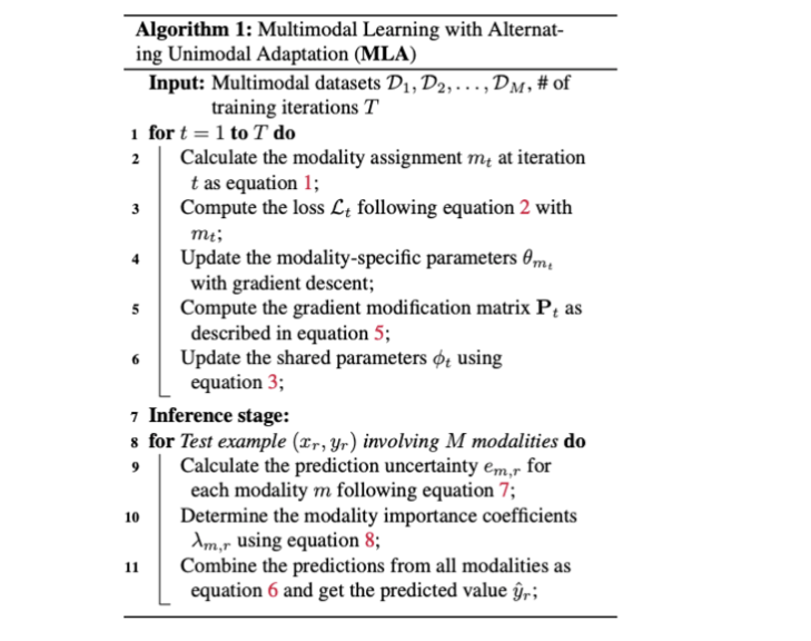 위의 내용을 정리하면, 멀티모달 학습에서 alternating unimodal optimization을 도입한 MLA 입니다. 이 접근 방식은 각 모달리티 내에서 상대적으로 독립적인 최적화를 가능하게 할 뿐만 아리라 모달 간 상호 작용도 보존합니다. 또한 MLA는 학습 과정에서 완전한 모달리티와 missing된 모달리티가 모두 포함된 상황에서도 호환됩니다.