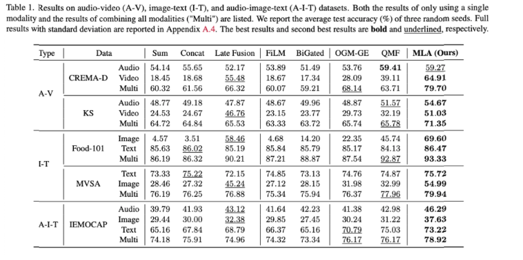 1. late fusion을 제외한 대부분의 기존 fusion 및 modulation기반 방법론들은 modality lazines 문제에 직면한 것을 확인할 수 있습니다. 이는 우수한 모달리티의 성능과 열등한 모달리티 성능 간의 수많은 데이터셋에서 눈에 띄는 성능 격차로 입증할 수 있습니다.