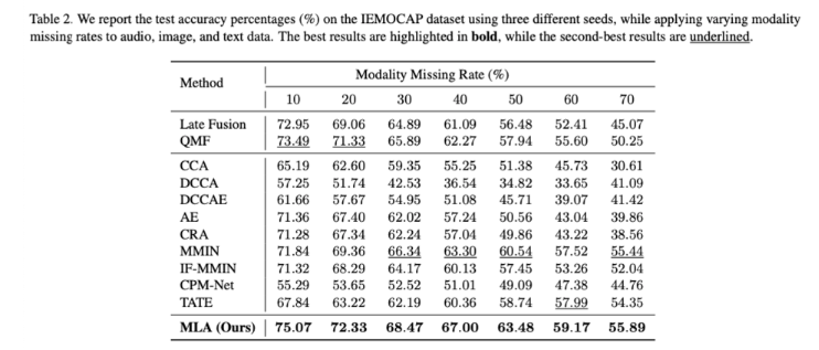 • MLA는 일반적인 방법(late fusion 및 QMF)과 missing modality를 해결하기 위해 특별히 고안된 방법(예를 들어 MMIN)을 포함한 모든 missing rate에서 다른 baseline보다 일관되게 우수한 성능을 보였습니다. 이러한 결과는 modality missing 학습이라는 극단적인 상황에서도 modality laziness 문제를 해결하는데 있어 MLA가 효과적이라는 점을 강조하는데요. 이는 single-modal 학습과 test-time dynamic modality fusion 메커니즘을 번갈아 사용하는 것이 효과적이라는 것을 강조합니다.
