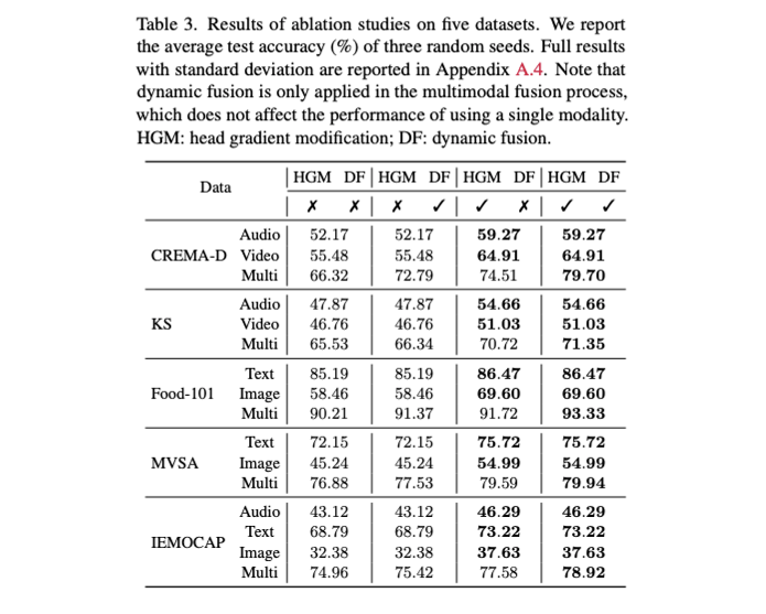 ablation study는 Table 3를 통해 확인할 수 있습니다. alternative unimodal learning framework에서 head weight를 수정하면 단일 모달리티 정보만 사용할 떄와 멀티모달 정보를 사용할 때의 성능이 모두 향상되는 것을 확인할 수 있는데요. 이러한 개선은 modality forgetting을 완하하면서 corss-modal information을 더 잘 통합할 수 있어 single-modal, multi-modal 프로세스 모두에 도움되기 때문입니다. 또한, test-time dynamic fusion을 사용하며면 멀티모달 학습 프로세스를 크게 발전시킬 있습니다. 최종적으로 두 방법을 모두 융합하여 사용함으로써 최고 성능을 발휘할 수 있습니다.