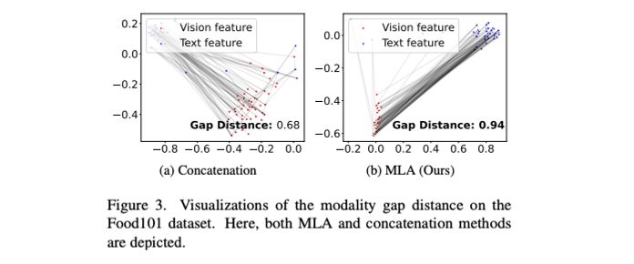 논문을 보면서 흥미로웠던 Figure가 바로 Figure3인데요. 이전 멀티모달 논문에서는 이러한 피규어를 본 적이 없어 신선하였습니다. 멀티모달 학습에는 서로 다른 모달리티 정보가 임베딩 공간 내에서 완전히 분리된 두 영역에 위치하는 modality gap이 존재하는데요. 이 modality gap은 모델 성능과 상관관계를 나타내며, 이를 늘리면 멀티모달 학습의 성능을 어느정도 향상시킬 수 있다고 합니다. MLA로 인한 성능 향상을 이해하기 위해 Food101 데이터셋의 test, vision modality의 gap을 시각화하면 Figure 3을 그릴 수 있는데요. (a) concatnation과 (b) MLA와 비교하면 MLA를 사용했을 때 modality gap이 더 커지며, 이는 서로 다른 모달리티를 더 잘 구분할 수 있음을 나타낸다고 합니다.