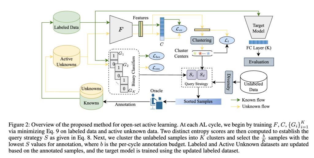이를 해결하기 위해 저자는 새로운 AL 방법론을 제안합니다. 이 방법론은 두 가지 다른 엔트로피 점수를 사용하고 통합합니다. 첫 번째 엔트로피 점수는 known 분류기의 출력을 사용하여 계산됩니다. 이 점수는 known 데이터 분포에 대해서 샘플의 불확실성을 측정합니다. 두 번째 엔트로피 점수는 distance-based을 활용하는데 이는 unknown 데이터 분포에 대해서 샘플의 불확실성을 측정하는데 사용이 됩니다. 마지막으로, 모든 언라벨 샘플에 대해 두 가지 엔트로피 점수를 결합하여 AL을 수행합니다. 또한 저자는 샘플의 다양성을 보장하기 위해 클러스터링도 사용했다고 합니다.