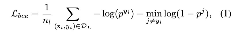 BC는 Binary Classifier를 의미합니다. BCE 손실 함수의 수식을 보면 -log(pi)-min(log(1-pj))이 되어있음을 확인할 수 있습니다. 이 수식에서-min(log(1-pi))를 추가시키는 이유는 i번째 decision boundary에 속하지만 다른 decision boundary와도 가깝게 속해있어 경계를 더 구분짓기 위해 사용하는 방법입니다. 예를 들어 총 3개의 클래스가 있을때 첫 번째 클래스에 속하는 이미지에 대해 p1의 확률값이 0.9이고 나머지 클래스의 확률 값이 각각 0.8,0.2를 가질때 여기서 negative decision boundaries는 0.8의 확률값을 가진 두번째 클래스가 되며 이를 손실함수에 포함시키겠다는 의미입니다.