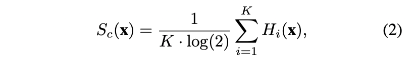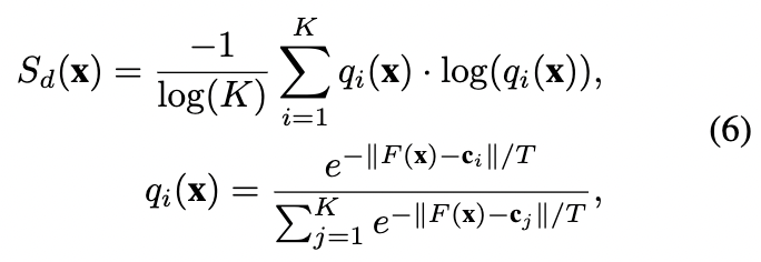 여기서 qi(x)는 샘플 x가 i번째 클러스터에 속할 확률이고, T는 temperature입니다. 기본적으로 샘플의 클러스터 중심으로부터의 거리를 계산하고, 확률 벡터 [q1(x), q2(x), …, qK (x)]를 형성하고, 이를 정규화된 엔트로피로 계산합니다.