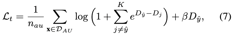 F (·)의 크로스 엔트로피 손실을 사용하여 일반적으로 known 샘플이 feature space에서 ci에 대해 높은 거리를 갖도록 훈련하므로 높은 Sd값이 보장됩니다. 그러나 모든 active unknowns 샘플들을 하나의 open-set class로 취급하므로 unknown 샘플에 대한 낮은 Sd 값은 보장할 수 없습니다. 따라서 저자는 각 클러스터 내에서 더 밀집성을 높이고 서로 다른 클러스터 사이의 거리를 유지하기 위해 피쳐를 정규화합니다. 구체적으로, DAU 샘플의 샘플 x에 대해 Tuplet 손실을 사용하여 F(x)와 클러스터 중심 cy^ 사이의 거리를 줄이고 cy^로부터의 거리와 cj != y^ 사이의 거리 사이의 큰 거리를 갖도록 설계합니다. 이 손실은 다음과 같이 작성할 수 있습니다