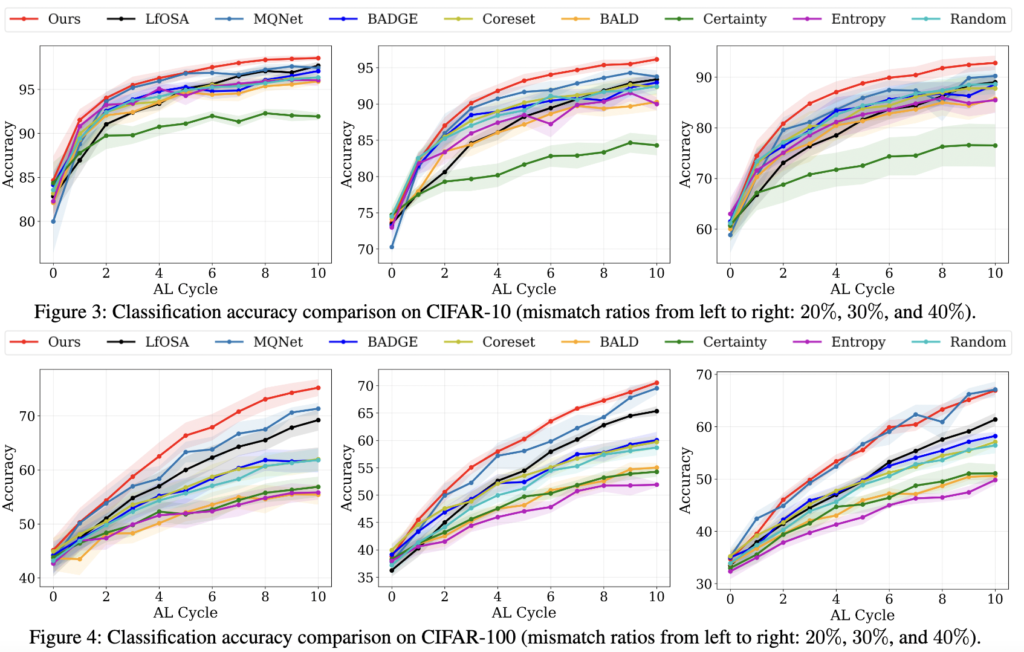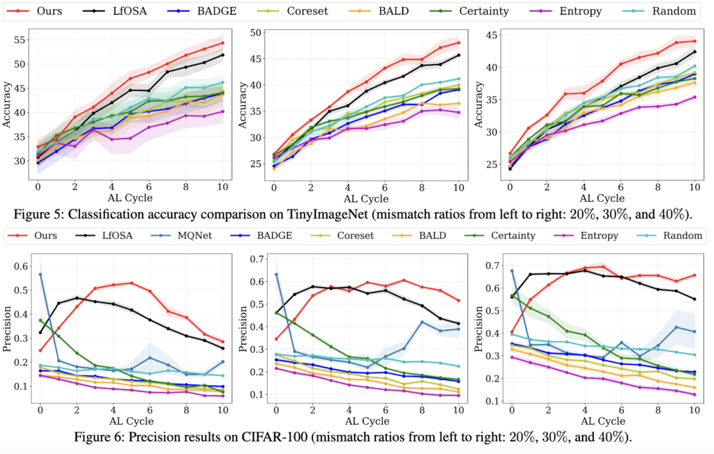 실험 결과 Fig 3, 4, 5를 확인해보면 제안된 접근 방식이 거의 모든 데이터셋과 mismatch ratio에서 다른 baseline을 능가하는 것을 볼 수 있습니다. 구체적으로, 저자의 방법은 CIFAR-100에서 mismatch ratio이 20%인 경우 MQNet 및 LfOSA와 비교하여 각각 3.88% 및 6.00%의 차이를 보이고 mismatch ratio가 증가함에 따라, LfOSA와 표준 AL 방법 간의 성능 격차가 줄어드는 것을 관찰할 수 있습니다. Fig 6에서는 다양한 AL 방법들과 비교하여 known 샘플을 고르는 정밀도 실험을 진행합니다. 이 그림에서 볼 수 있듯이 저자의 접근 방식은 다른 AL 방법들보다 좋은 precision 결과를 보이는 것을 확인할 수 있습니다.
