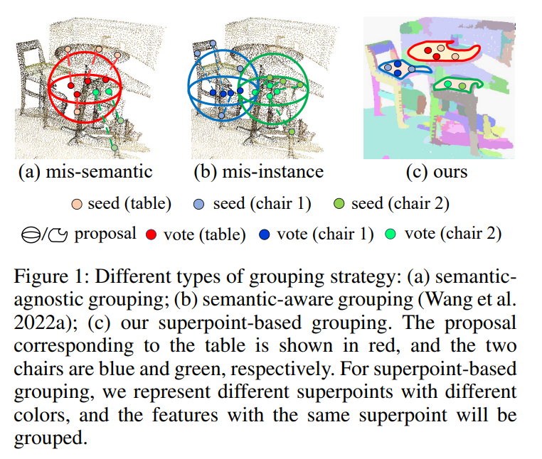 voting 이후의 grouping에서 흔히 사용되는 방식은 semantic agnostic과 semantic aware, 크게 두 가지로 나뉩니다. 먼저 semantic agnostic 방식은 포인트 좌표 사이의 거리를 기준으로 그룹을 만들게 되는데, 이는 scene 내에서 다른 카테고리에 속하면서 다양한 instance로 구성되어있을 때 Fig.1(a)와 같이 동일한 물체에 속하는 포인트를 하나의 그룹으로 만들기 어렵습니다. semantic aware의 경우, semantic agnostic과 달리 semantic 정보까지 고려하지만 같은 카테고리에 속하는 물체이지만 서로 너무 가까이 배치되어 있다면 Fig.1(b)와 같이 여전히 그룹화하는데 어려움이 존재합니다. 결국 현재 사용되는 voting과 instance agnostic한 그룹화 방식은 proposal에 대한 outlier와 노이즈를 발생시킵니다. 그래서 본 논문에서는 위와 같은 문제를 해결하기 위해서 superpoing를 사용하여indoor 환경에서 anchor free의 one-stage 모델 SPGroup3D를 새롭게 제안합니다.