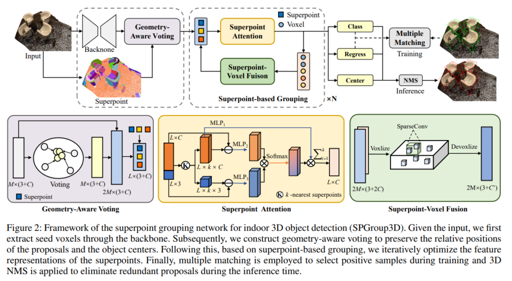 모델의 전반적인 동작 과정을 설명해보자면, 먼저 입력으로 들어오는 N개의 포인트는 \{p_i}^N_{i=1}으로 표현되며 여기서 p_i는 \mathbb{R}^6으로 포인트의 좌표인 x, y, z와 컬러 정보인 r, g, b로 이루어져 있습니다. 이러한 입력 포인트를 비어있는 공간이 없는 복셀 구조로 변환하기 위해 sparse 3D 백본 네트워크를 사용하여 M차원의 복셀을 얻게 됩니다. 복셀을 만들었으면 이 복셀과 raw한 포인트 클라우드에서의 superpoint가 geometry aware voting 모듈과 superpoint 기반의 그룹화 모듈을 통과하여 물체에 대한 propsal을 제안하는 것이죠. 학습 중에는 마지막에 다중 매칭을 통해 positive 샘플을 선택하여 사용하고, inference에는 3D NMS를 통해 불필요한 proposal을 제거합니다.