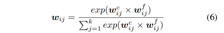 이러한 좌표와 feature 공간 가중치를 곱하여 소프트맥수 함수를 적용하면 정규화된 fusion 가중치를 얻을 수 있습니다. 즉 i번째 superpoint와 가장 가까운 k개의 이웃 중 j번째 superpoint에 대한 fusion 가중치 w_{ij}는 식(6)으로 정의할 수 있습니다.