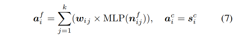 마지막으로, 이러한 fusion 가중치에 k개의 포인트에 대한 feature을 곱하여 업데이트된 feature을 얻고, 포인트의 좌표는 변경되지 않은 상태를 유지하는데, 이는 식(7)과 같이 표현합니다.