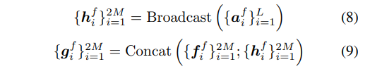 - {h^f_i}^{2M}_{i=1} : {a_i}^L_{i=1}의feature를\{f_i\}^{2M}_{i=1}의 크기와 동일하도록 broadcasting한 결과