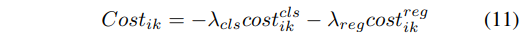 - cost^{cls}_{ik}, cost^{reg}_{ik} : focal cost 함수, DIoU cost 함수